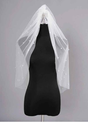 This single-tier, elbow-length veil is elegantly detailed with round white pearls from top to bottom..