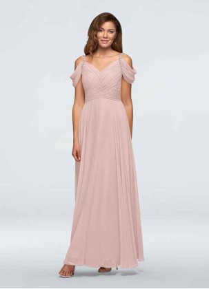 Singer is a traditional floor-length, A-line chiffon and lace dress. Her flattering v-neck lace bodi..