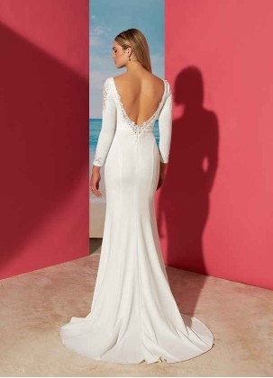 Walk down the aisle in grandiose fashion wearing Saffron, our luxurious lace and stretch crepe merma..