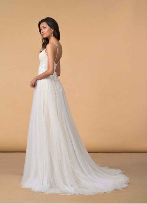 Rivi is our lovely bridal gown cut from tulle and lace. She features a V-neckline with a knot detail..