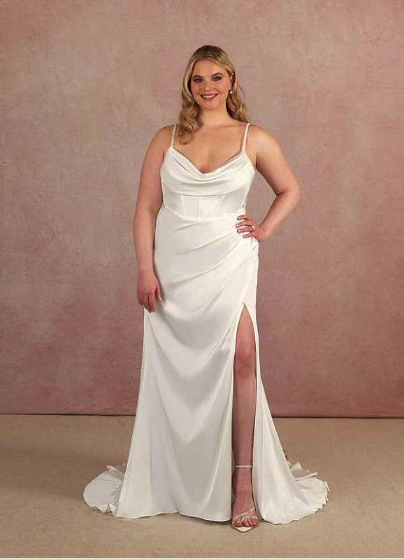 Stun the crowd as you walk down the aisle in Starlow, our modern bridal gown crafted from silky stretch satin. Designed for the minimalist bride who also wants a little glam, the hand-pleated bodice and underbust boning creates a beautiful and supportive fit. Delicate pearl beading adorn the spaghetti straps for an added touch of detail. The mermaid skirt is pleated at the midsection which extends to a dramatic leg slit. The look is complete with a chapel length train.