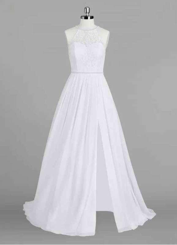 This ethereal beauty will have you feeling like royalty on the big day with its delicate lace, illusion halter neckline combined with the intricate hand beaded waistband, neckline and straps. Calyssa's bold lace illusion side panels add some adventure to this light and airy gown, topped off with a gorgeous gathered skirt with a sultry side slit. Available in full size range (WD0-WD30) and in custom sizing.
