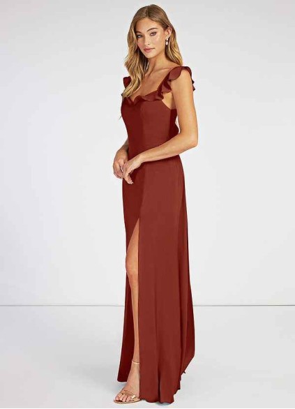 Arela will have any bridal party singing with delight. She is cut from stretch chiffon in an amusing A-line silhouette. Her scoop neckline is adorned with a cascading ruffle that wraps around and joins to a long bow/tie sash that sits atop a drop waist. The flowy skirt moves beautifully with the added leg slit.