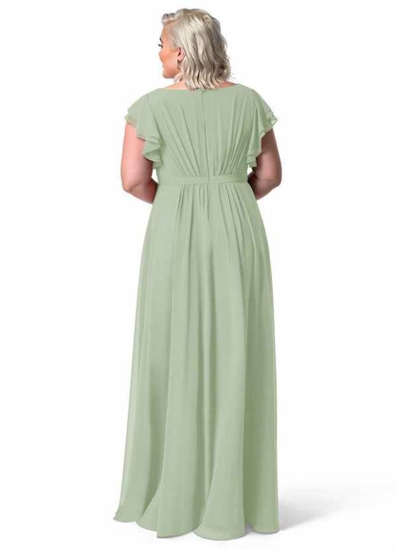 Daphne is our floor-length modest bridesmaid dress made of chiffon with an illusion scoop neckline. Daphne features an A-line cut with cascading ruffle sleeves. Stylist Note- Daphne does not have sewn-in cups.  Available in full size range (A0-A30) and custom sizing.