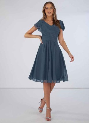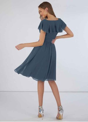 Hadley is a modest A-line cut knee-length dress. This chiffon beauty features a capelet with a flirt..