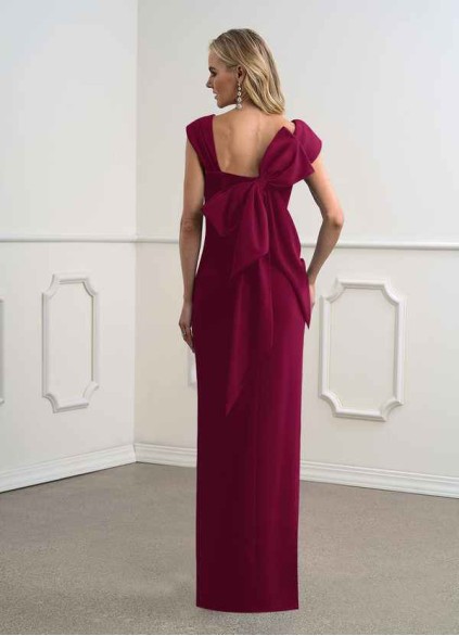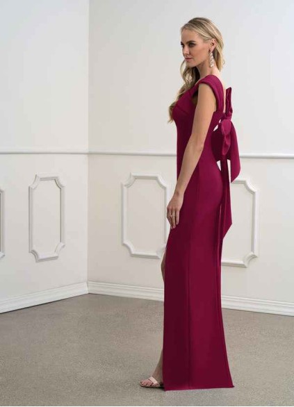 Ellen is a fashionable, floor-length stretch crepe column gown. Her current, asymmetrical straps are adorned with an origami style bow at the back. There is a side slit to ensure total freedom of movement on the dance floor.