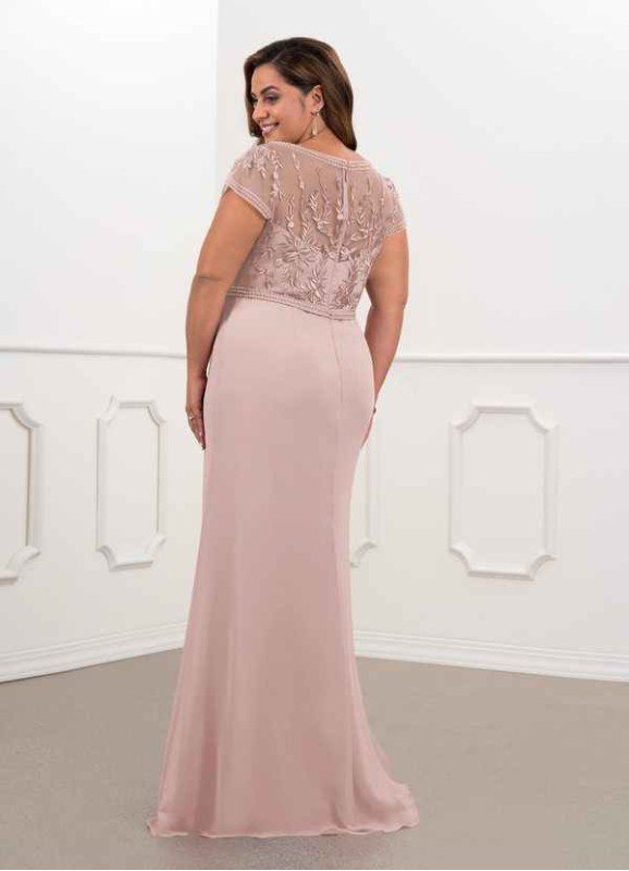 Silvia is glamorous and elegant style for any special occasion. Made from chiffon she features an illusion tulle bodice with lace applique and bataeu neckline. The beauty of this dress is the handmade beading along the bodice placket and trimmed along the cap sleeves and waistline. Her mermaid cut skirt also has pleating at the center front waist to elongate the body and create a flattering silhouette.