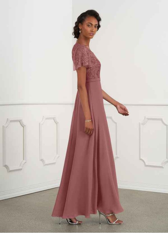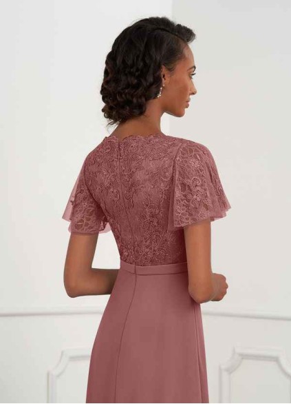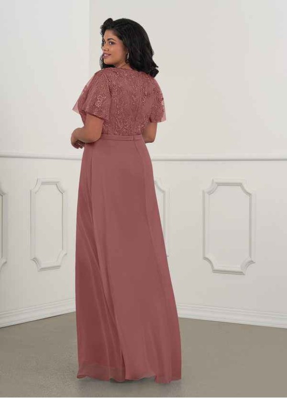 Singer is a traditional floor-length, A-line chiffon and lace dress. Her flattering v-neck lace bodice has flutter sleeves to give a sense of whimsy. Her waist has a belt that floats atop a small a-line skirt that has a center back slit for ease of movement.