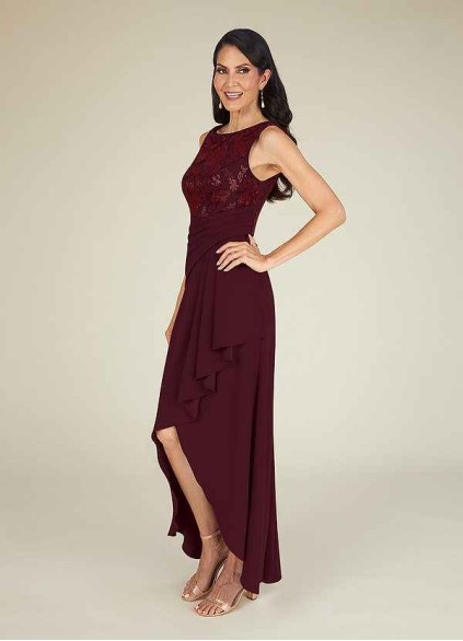 Have an enjoyable time at any occasion while wearing out stretch crepe and sequin lace A-line dress, Isla. She has a scoop neckline bodice with a wrap waist and pleating details. Her skirt has pleating cascades and a high-low hem that allows for ease of movement.
