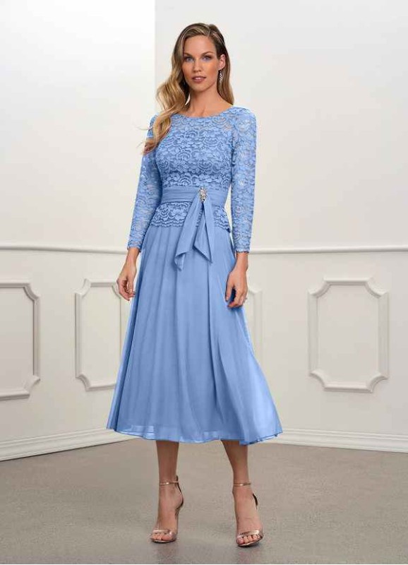 Charlee is a sweet, feminine, tea length dress. The lace top and mesh skirt appear to be separates but are in fact a one-piece dress. A detachable pleated sash with embroidered applique is included to finish the fun yet sophisticated look.