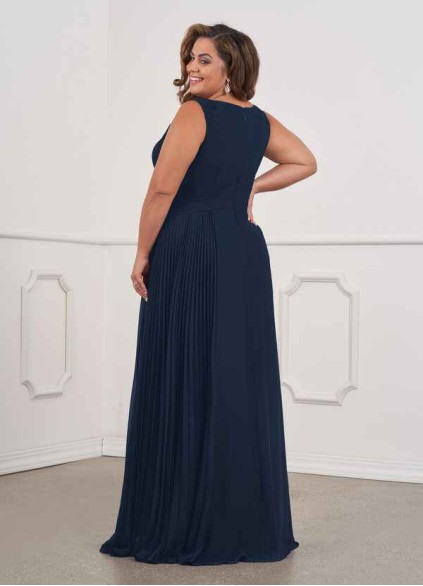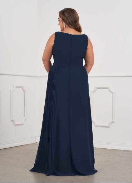 Galvan is a figure flattering and elegant dress for any occasion. Made from chiffon she features a bateau neckline with lace appliques and beading across the shoulders. An asymmetrical pleated band framed across the waist accentues the figure and leads to a sunburst pleated drape and side leg slit.