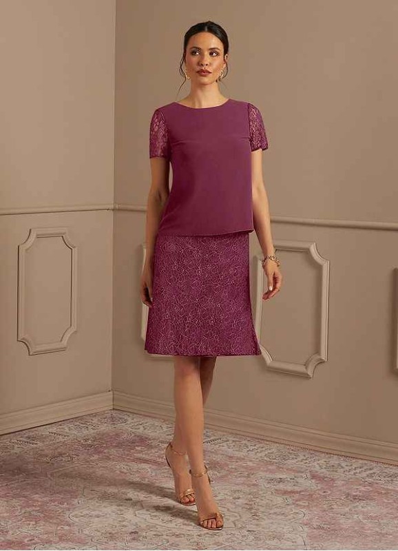Deva is our chiffon and Chantilly lace blouse. Her clean scoop neckline has shor chantilly lace sleeves that offer a comfortable fit. She sports a covered button back closure on top of a keyhole. She provides comfort with her loose fit. Mix & Match with our other separates! This style matches well with our Asher, Shiloh, and Fallon.