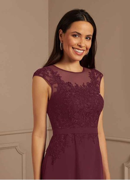Klaus is our gorgeous gown cut from chiffon and tulle. She features an illusion scoop neckline paired with handmade beading and lace applique. The look is complete with an A-line skirt.Jacket Included.