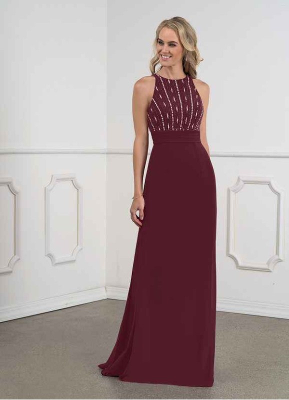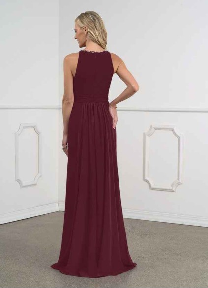 Lala is a beautiful floor length, A-line chiffon gown. The halter neck bodice features delicate hand beading in a sunburst pattern. A gathered waist band cinches in the waist which flatters the figure. The skirt is gathered at center back which allows the dress to really flow in the wind.