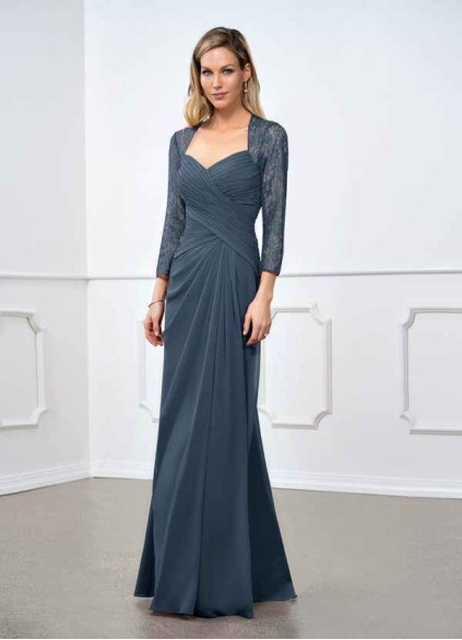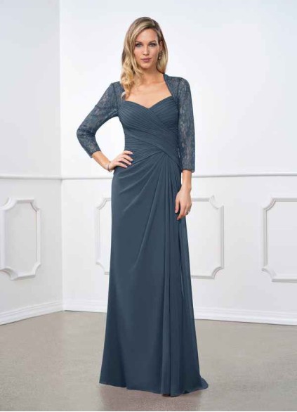 Trudith is a column gown cut from chiffon. She features a pleated sweetheart neckline with long lace sleeves. For an elegant look, the skirt is draped to compliment the bodice.