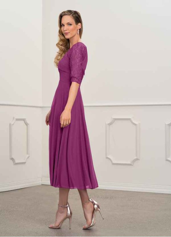 Gracelyn is a versatile tea-length for any occasion. Her scoop neckline has flattering mesh draping that opens to a flirty A-line skirt, while her lace sleeves add a delicate feminine touch.