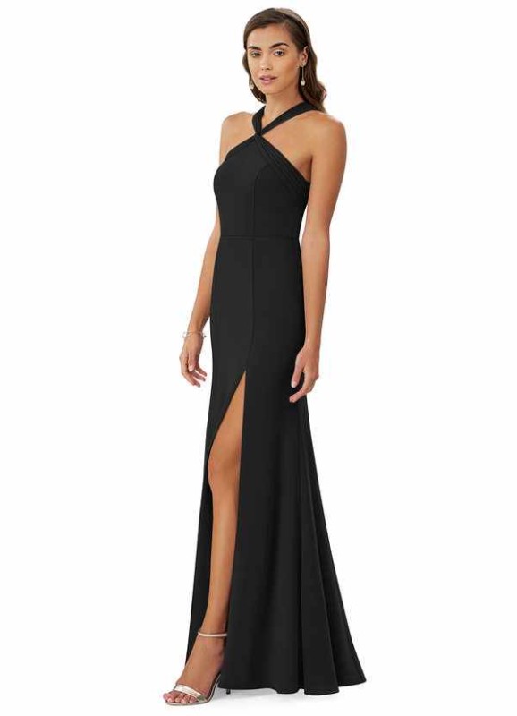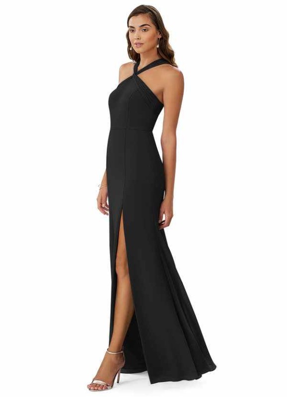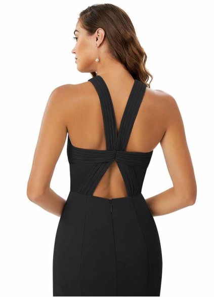 Feel like a Greek mythical goddess wearing Rue. Featuring a twisted halter neckline, her bodice has a pleated detail that connects to the straps. Her pleated straps meet at the center back bodice with a hook and eye closure, creating a back cutout. Made of chiffon, her floor length mermaid silhouette is finished with a leg slit.