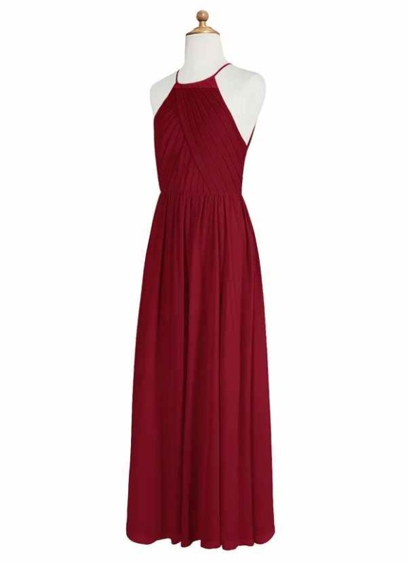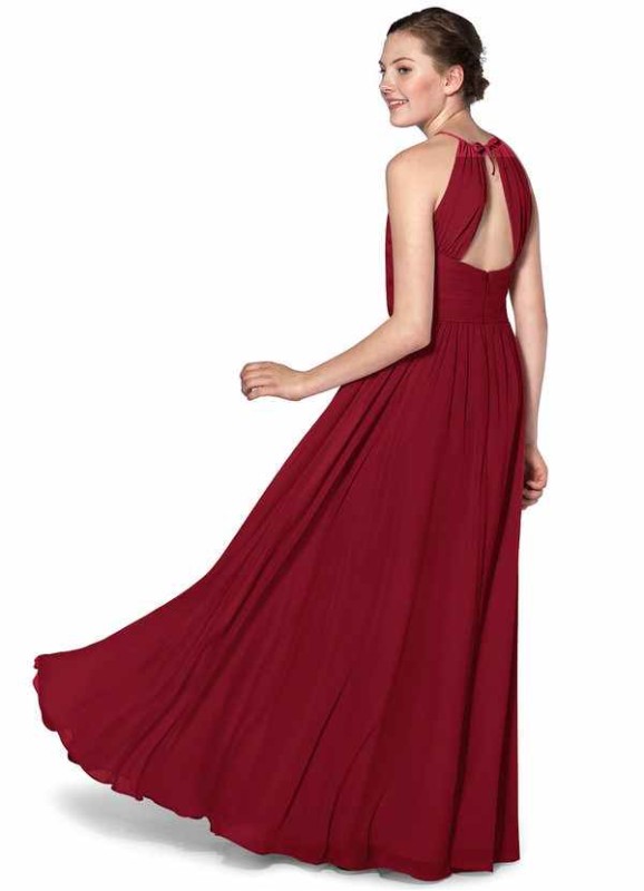 Here is Jessamy! She is a floor length, A-line dress. Some of her details include having a strapless, halter neckline, pleating and keyhole. Her chiffon shell and rigid lining complete this stunning design.