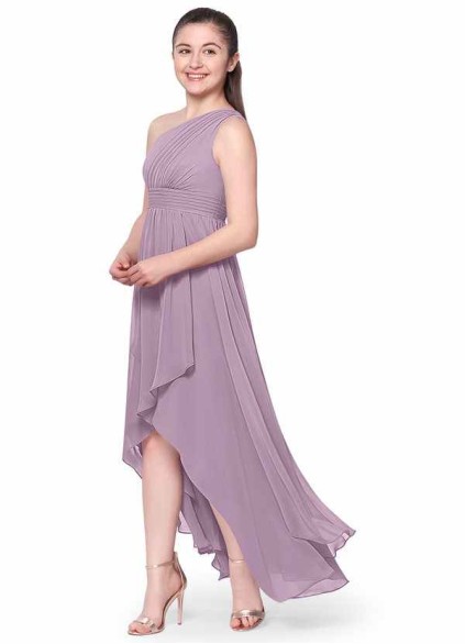Mathilda JBD is a sweet but elegant dress for your girls. She features a one shoulder neckline and softly-gathered pleating overlay bodice. Made of chiffon, her modern, overlapping high-low skirt is cut in an A-line silhouette, finished with a pleated waistband. She is designed for you to coordinate your bridal party with our Mathilda bridesmaid dress!