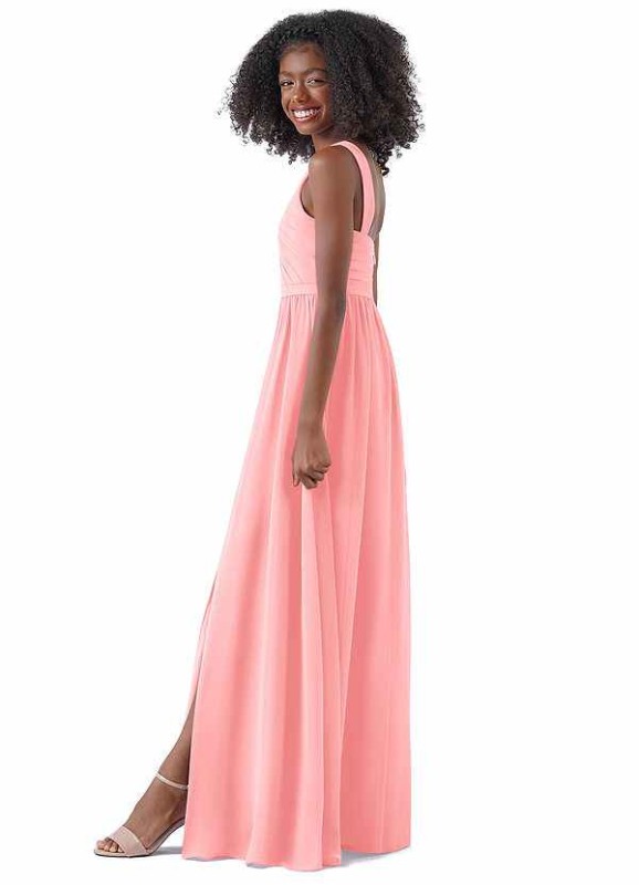Evie is the perfect dress for your junior bridesmaids. Made from chiffon, this elegant A-line silhouette features pleated straps, multi-directional pleating forming across the bodice, and a waistband. A fashionable low leg slit adds a stylish touch to her full skirt.
