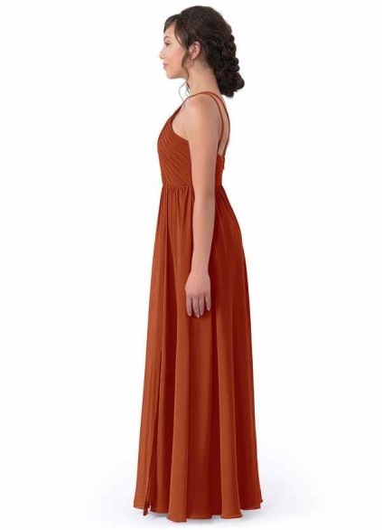 Leighton is a classic and elegant style for your junior bridesmaids. Featuring a delicate hand pleated bodice, she has multi-spaghetti straps. Made of chiffon, her floor length A-line skirt has soft gathering along the waist and a low leg slit.