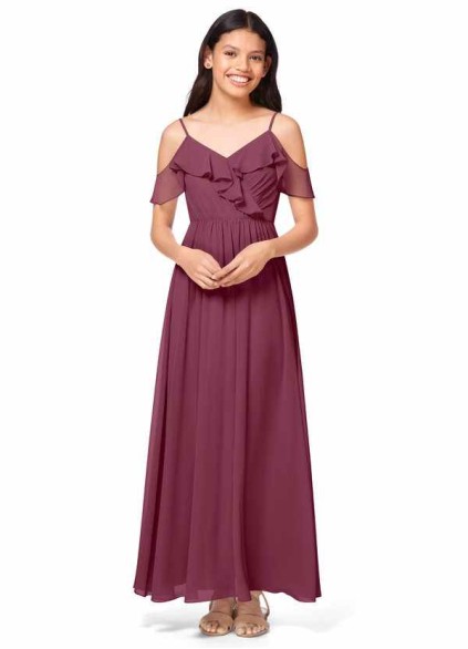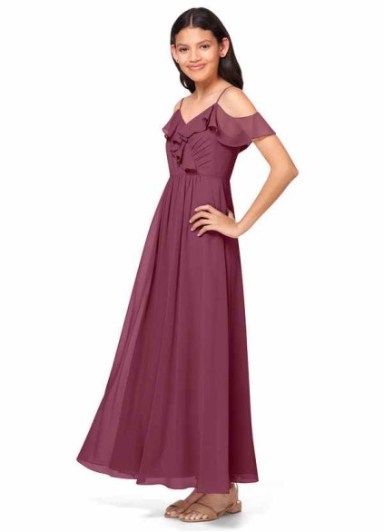 Feel sweet and girly wearing JBD Jackie! She has an overlapping V-neck bodice with pleating overlay, and ruffles flowing along the neckline that turns into fun cold-shoulder flounce sleeves. Made from flowy chiffon, her floor length A-line silhouette has soft gathering on the center front skirt.