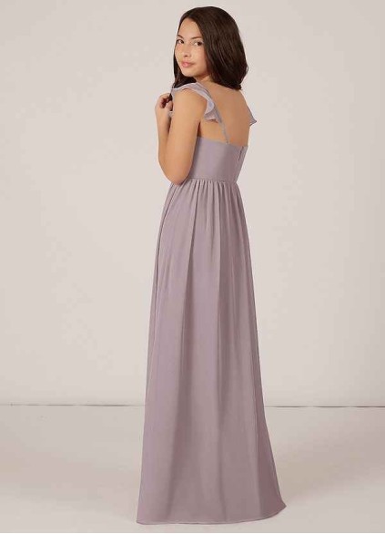 Gale is our lovely junior bridesmaid dress cut from chiffon. She features a V-neckline with a ruffle detail that extends to the back spaghetti straps. The look is complete with a gathered A-line skirt.