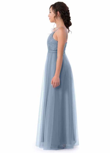 Whimsical and ethereal, Layla JBD is the dress of your dreams. She has a V-neck bodice with a corded lace appliques overlay. Delicately pleated illusion panels add dimension and style to this feminine gown. Made of airy tulle, her floor-length A-line silhouette has a waistband cinched at the waist for a figure-flattering effect. You can coordinate Layla JBD with our Layla bridesmaid dress.