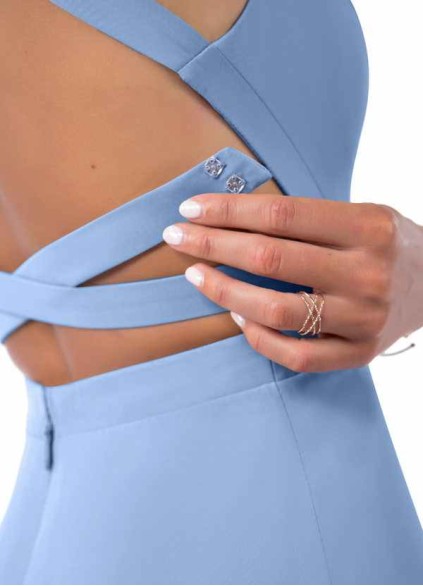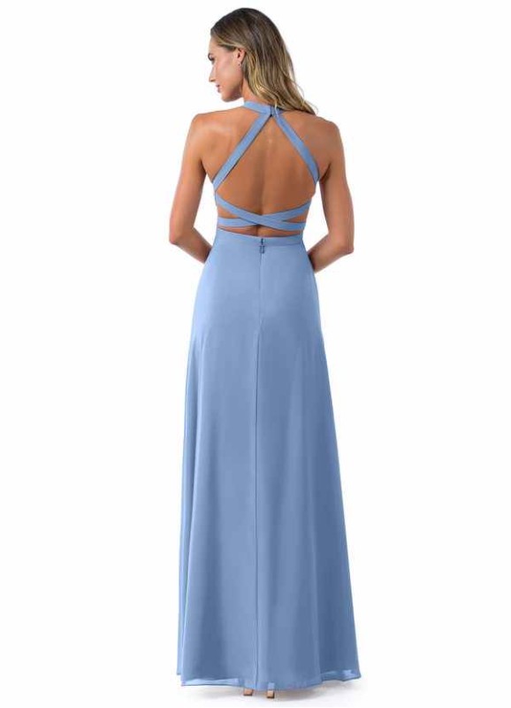 Let your bridal party be sleek yet comfortable as they wear our chiffon dress, Clarice. Her clean halter neckline is complemented by the criss-cross strap back that has snap closures. The slim A-line skirt has a front side slit that will show off their beautiful shoes.