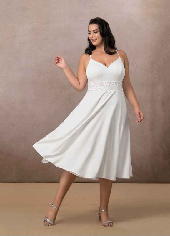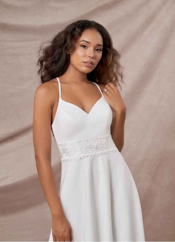 Enjoy your minimony while wearing Minerva our lace and stretch crepe demi gown. Her V-neckline is held aloft by spaghetti straps that join at the back atop an illusion lace back. The waist is adorned with lace that sits above a tea length full circle skirt.